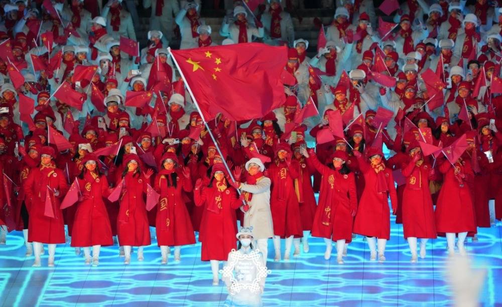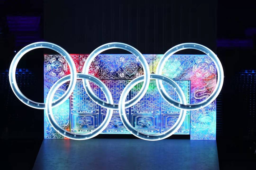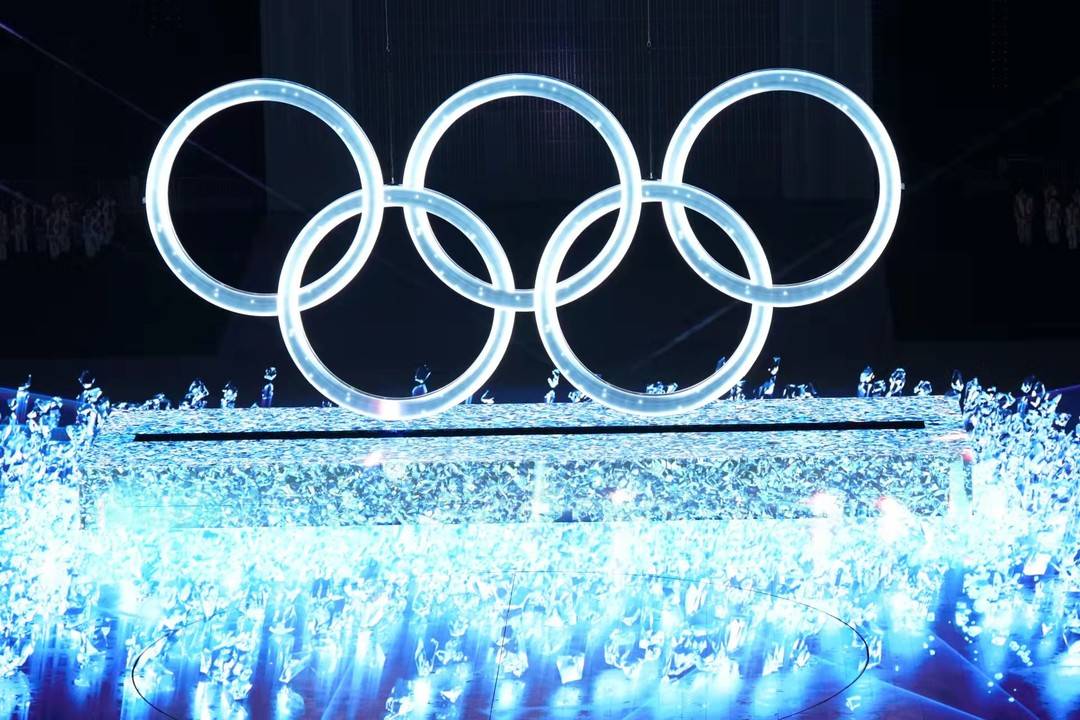 五星红旗与奥运五环标志一起闪耀在北京冬季奥运会开幕式现场。