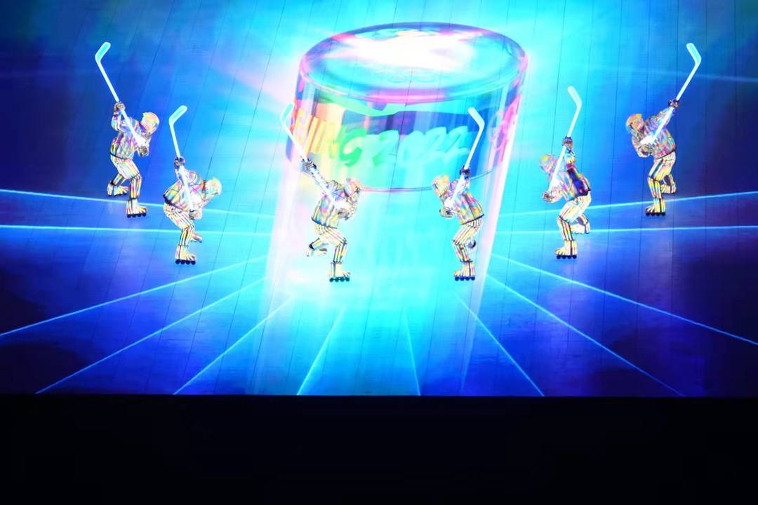 冰球撞向“冰立方”,一个晶莹剔透的冰雪五环从冰立方当中雕刻出来。“破冰”寓意着打破隔阂、互相走近,大家融为一体。