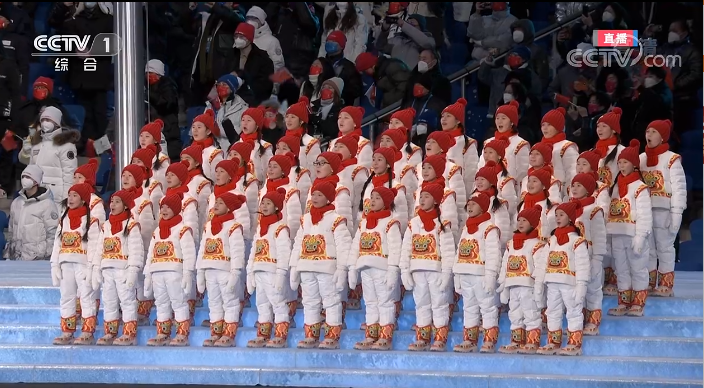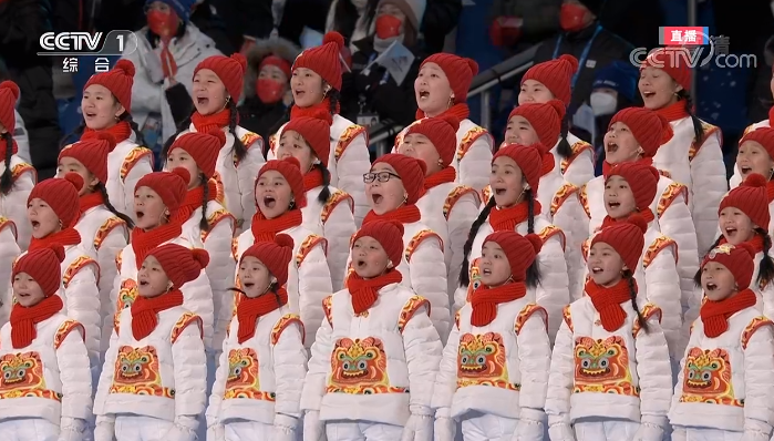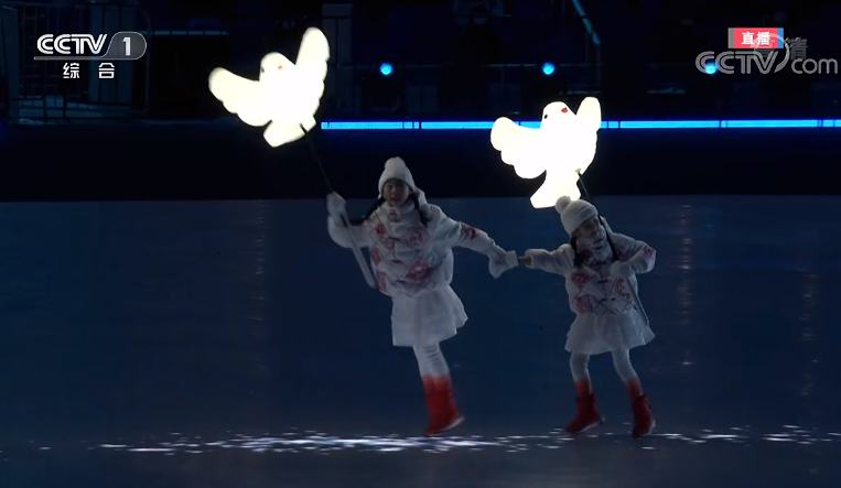 在开幕式的《雪花》篇章里,几百个孩子手持和平鸽形状的道具灯,在鸟巢中无拘无束地起舞、游戏,一曲童声合唱的《雪花》悠扬清澈,天真动人!