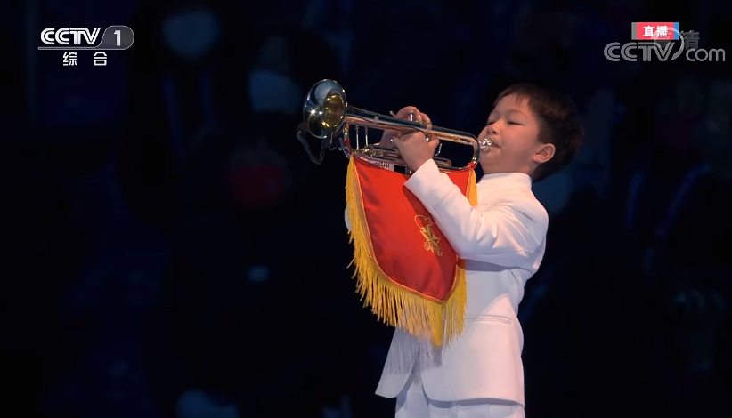 开幕式国旗传递环节,一名小男孩站在旗杆下,用小号吹响了嘹亮深情的《我和我的祖国》。小号声响起的瞬间,全世界观众的目光都落在这个稚嫩可爱的孩子身上。